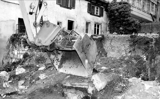 Der Bau hat begonnen: Baureferent Kurt Schönberger führte gestern mit dem Bagger den ersten «Hammerschlag» für die Überbauung Herrenacker Süd aus.